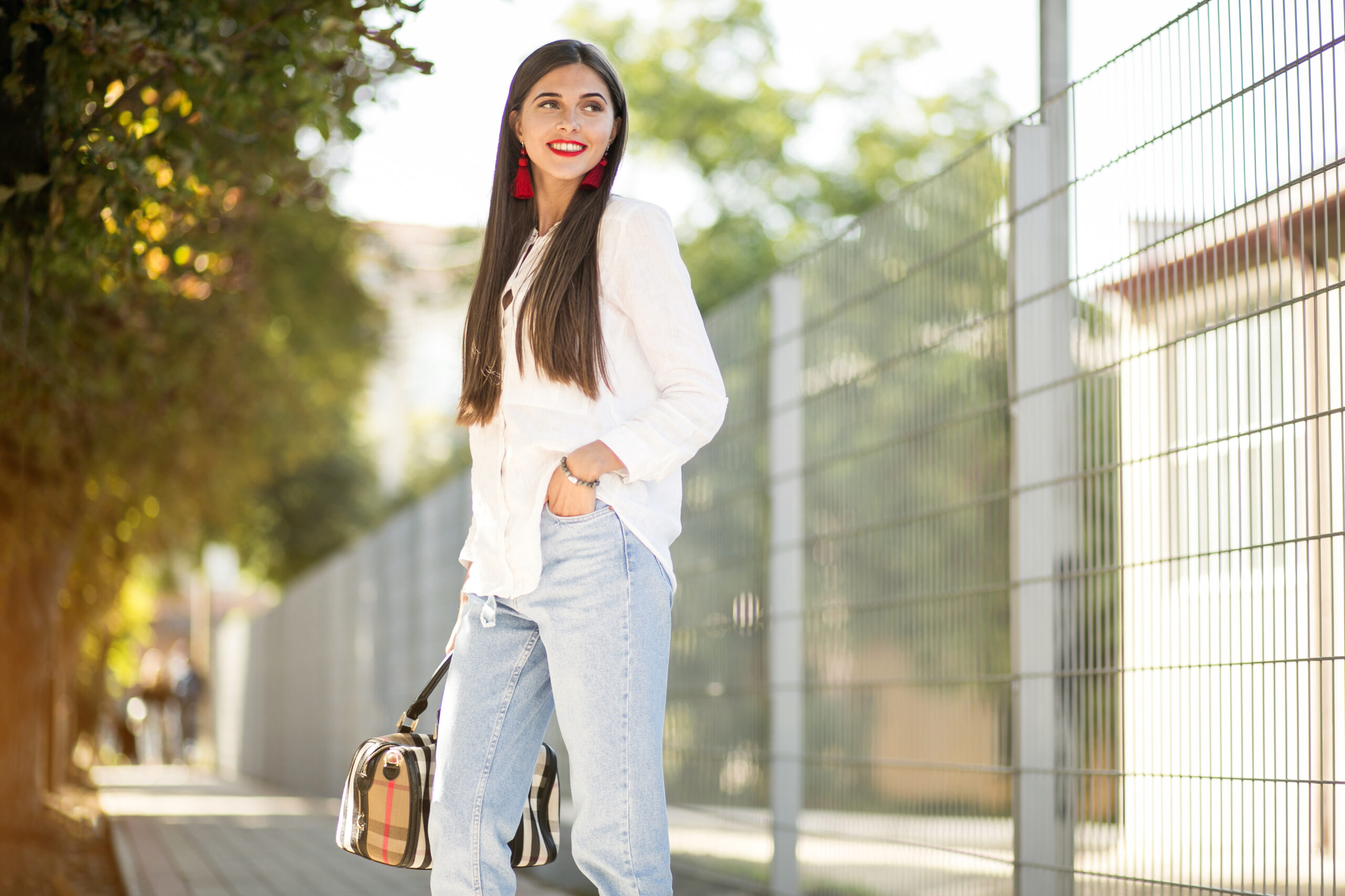 A stylish and casual look featuring a crisp white blouse paired with light blue denim jeans. The outfit is perfect for a relaxed day out, offering a clean and effortlessly chic vibe.